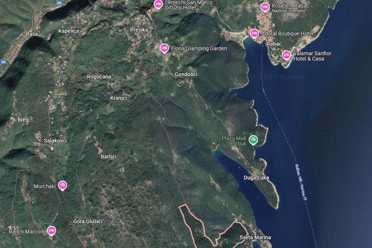 Rabac, Labin (Istria), in an excellent location, we are selling an undeveloped building plot measuring 9,160 m2, on which the construction of 7 residential villas with swimming pools is possible. The land offers a panoramic view of the sea and islands. The plot is located in a small settlement of modern residential villas, approximately 900 m from the sea, and just a few minutes' drive to the coast.